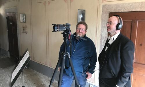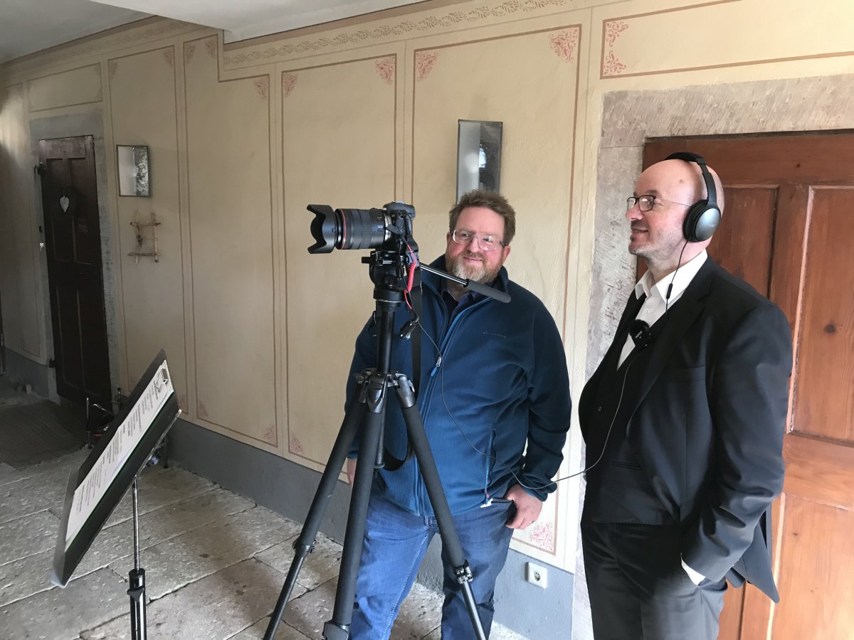 Im Anschluss an den Gottesdienst wurde das Wort des Landesbischofs zur Corona-Krise im Pfarrhaus Kleinolbersdorf aufgenommen. (im Bild Landesbischof Tobias Bilz und Übertragungsleiter Walter Müller-Wähner)