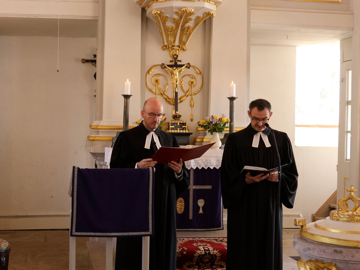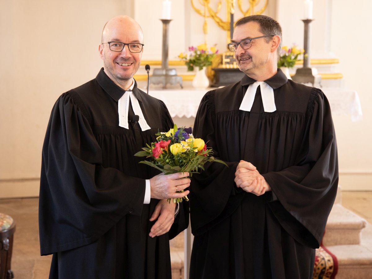 Landesbischof Tobias Bilz und Pfarrer Daniel Förster beim Fürbittgebet