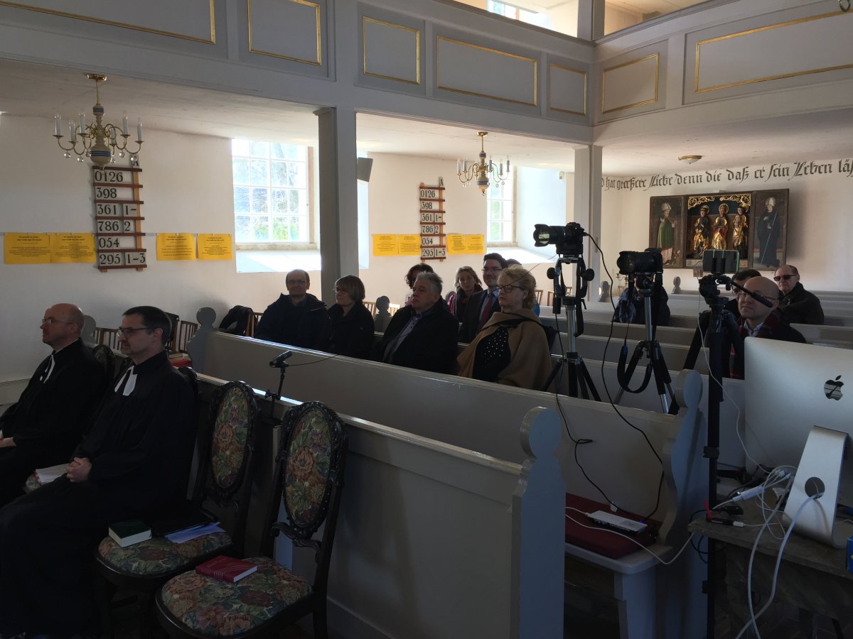 Die Absprachen mit allen Beteiligten vor Beginn des Gottesdienstes verliefen in gelöster Atmosphäre, die Aufregung war zu spüren, aber auch Erwartung und Vorfreude. Dann die Schrecksekunde während die Glocken bereits läuteten. Die Tonübertagung aus dem Kirchenraum war gestört. Eine besondere Herausforderung für Herrn Müller-Wähner, der an diesem Tag allein für alle technischen Belange zuständig war. Aufatmen, als er nach wenigen Augenblicken den Fehler beheben konnte. Insgesamt nahmen „nur“ 16 Personen vor Ort am Gottesdienst teil. Wie groß die Anzahl derer war, die uns am Bildschirm verfolgt haben, kann nur geschätzt werden. Über 5400 Nutzer hatten den Stream bis einen Tag nach Sendung abgerufen. Dass die Internetseite der Landekirche scheinbar davon überfordert war, ist bedauerlich und bedarf der Überprüfung. Nach Ende der Übertragung gab es in der Kirche lautstarken Beifall für Herrn Müller-Wähner und einen Strauß Blumen für den Landesbischof, dem für seine Antrittspredigt in Kleinolbersdorf gedankt wurde.