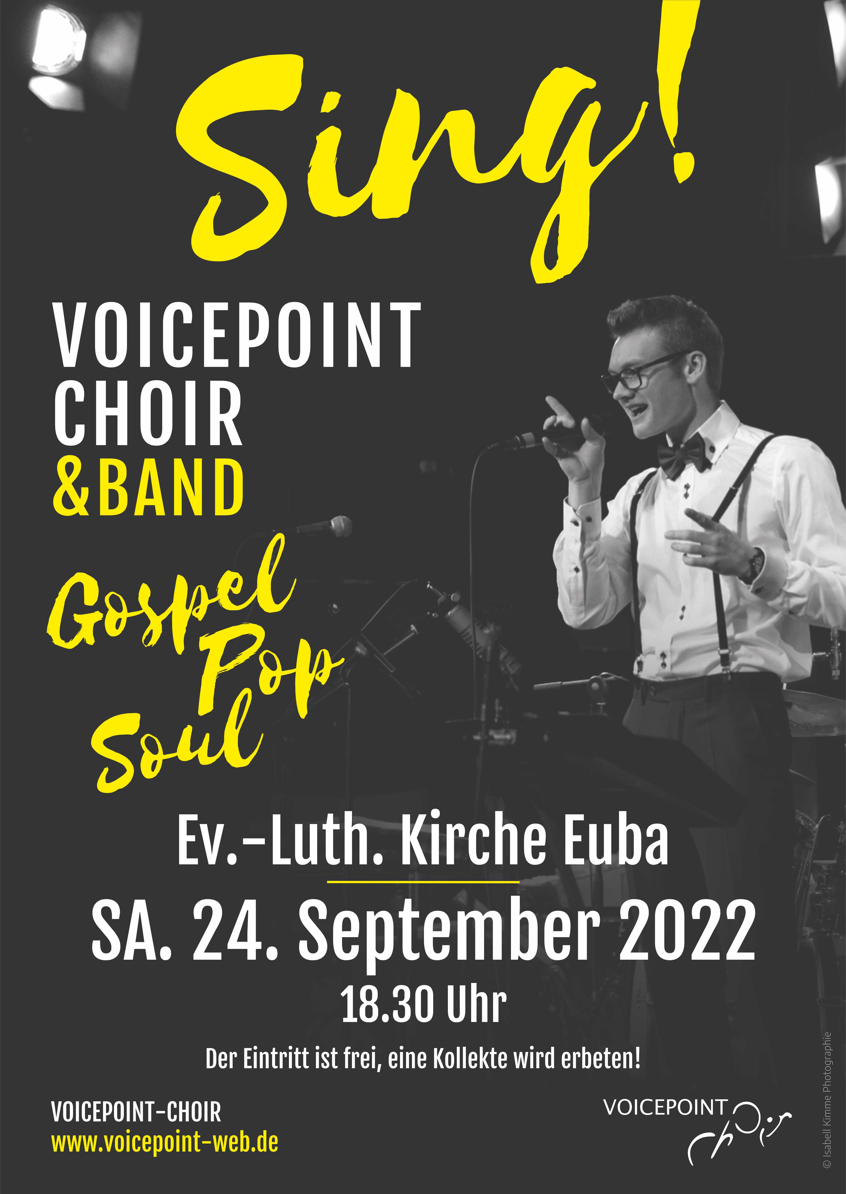 - 18:30 Uhr Voicepoint-Choir mit Liveband in der Eubaer Kirche | Infos: www.voicepoint-web.de | Konzert bis ca. 20:00 Uhr, Eintritt frei - Spenden gern
