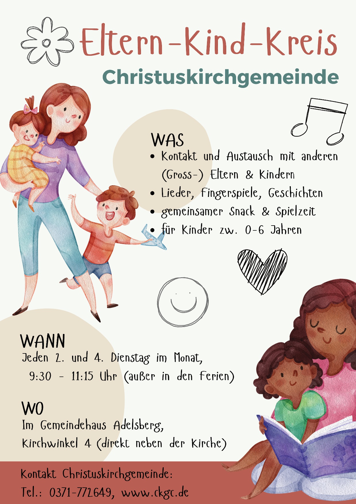 Der einstige Mutti-Kind-Kreis in Adelsberg wird weitergeführt. Mirjam Lehmann aus Reichenbrand hat seit Mai die Leitung übernommen. Neu ist, dass sich der Kreis jeden 2. und 4. Dienstag im Monat von 9:30 Uhr bis 11:15 Uhr im Pfarrhaus Adelsberg trifft. Da auch Väter willkommen sind und die Einladung an alle Eltern unserer vier Ortsteile ergeht, heißt der Kreis nun Eltern-Kind-Kreis der Christuskirchgemeinde. Die nächsten Termine sind: 22.8./ 12.9./ 26.9./ - / 24.10./ 14.11./ 28.11./ 12.12.